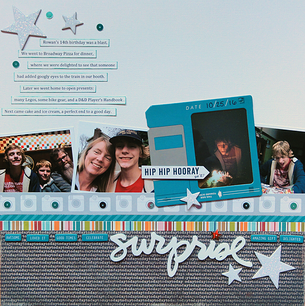 Next is a page using a new sketch with an old story starter. My son turned 14 last year, and the sketch had a number on it, so I used the design itself as inspiration. I started making a list of my son's 14 favorites right now, and he finished it. The photos are ones my mother took on his birthday.